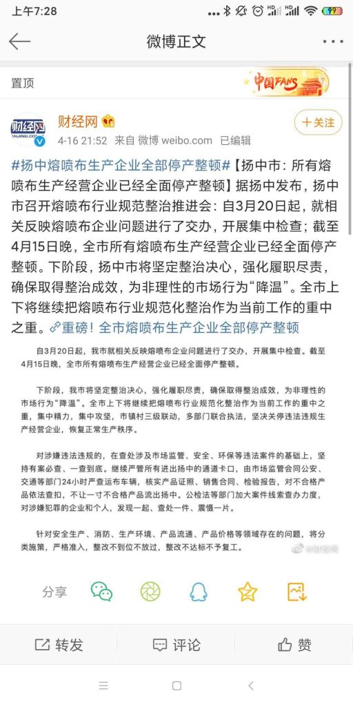 國(guó)家出手總是那么及時(shí),這兩天國(guó)內(nèi)部分地區(qū)集中整頓熔噴布市場(chǎng)上了熱搜,國(guó)家已經(jīng)開(kāi)始整治熔噴布亂象了,下一步,安評(píng)、環(huán)評(píng)、衛(wèi)生一卡可能好多小工廠都不能生產(chǎn)了,已經(jīng)能看到有小作坊甩賣生產(chǎn)線的了,對(duì)應(yīng)的那些手續(xù)齊全標(biāo)準(zhǔn)要求嚴(yán)格的企業(yè)則會(huì)更加如魚得水,熔噴布整治短期內(nèi)價(jià)格不好降,有兩級(jí)分化的可能,但短期內(nèi)大幅降價(jià)幾無(wú)可能。