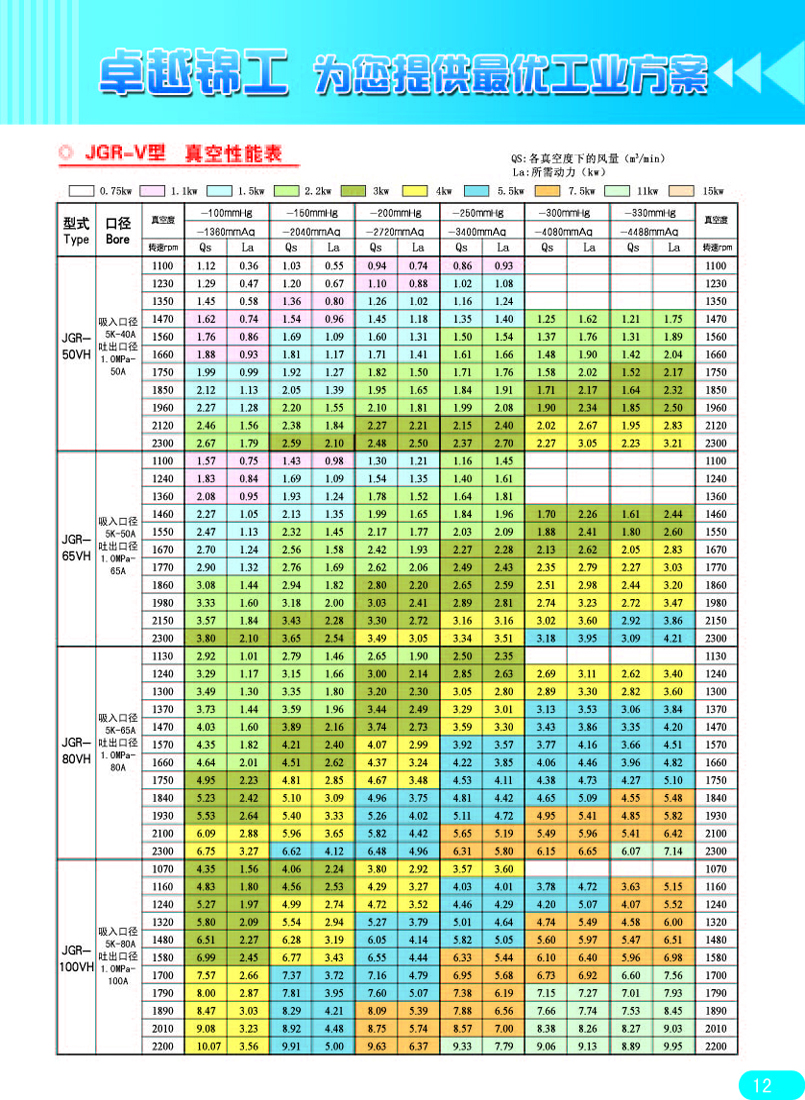 注:1、抽氣速率系指在配用推薦前級泵的條件下,羅茨真空泵的入口壓強在6650pa—2.66pa范圍內所測得的最大抽氣速率。
