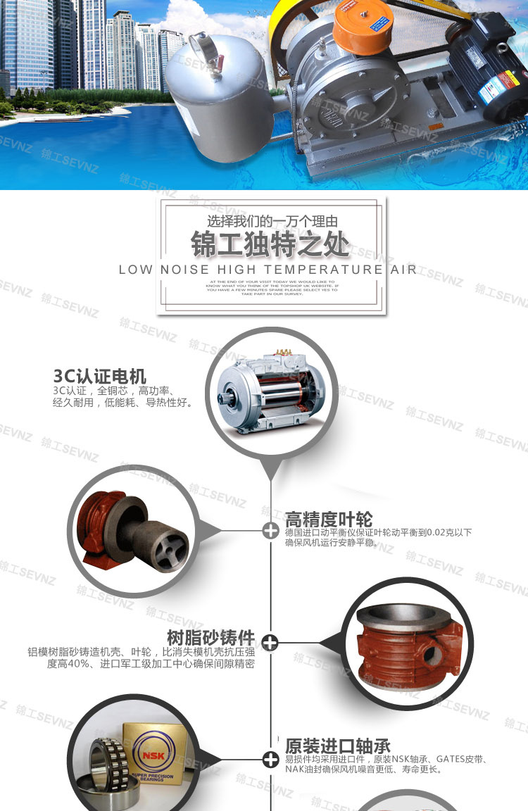 5、材質精良,結構巧妙,性能卓越。鼓風機全部采用優質的材料,結構精巧,堅固耐用,性能卓越,長期使用故障少。